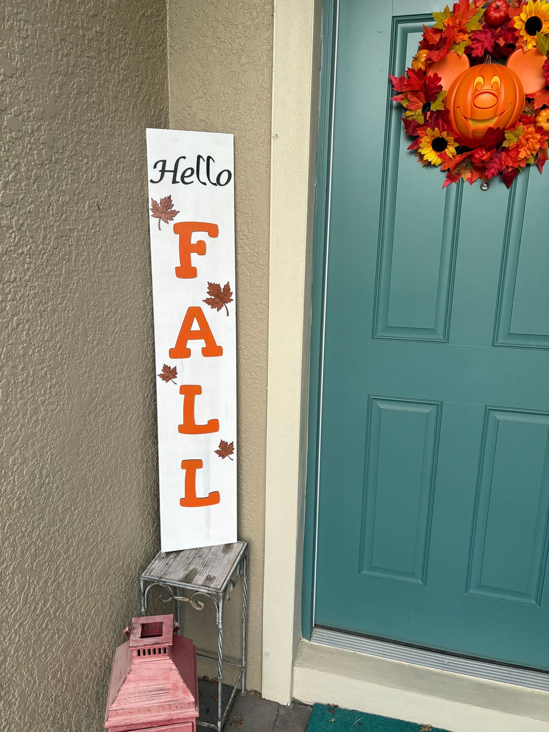 Welcome the cozy season with this charming "Hello Fall" porch sign, designed to bring the vibrant spirit of autumn to your home! Measuring 10 inches wide by 48 inches tall, this vertical sign is the perfect greeting for your front porch or entryway.